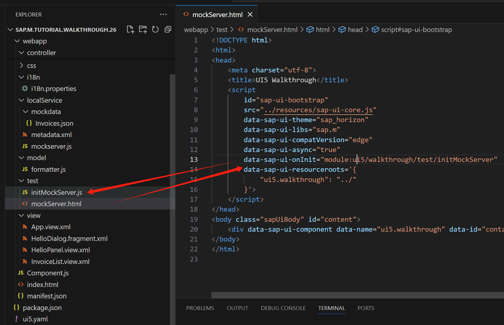 localService\mockserver.js初始化模拟服务器:rootUri: sap.ui.require.toUrl("ui5/walkthrough") + "/V2/Northwind/Northwind.svc/"配置需要被拦截的请求;const sPath = sap.ui.require.toUrl("ui5/walkthrough/localService");和oMockServer.simulate(sPath + "/metadata.xml", sPath + "/mockdata");加载了模拟返回的数据模型结构localService\metadata.xml与数据内容localService\mockdata\Invoices.json;